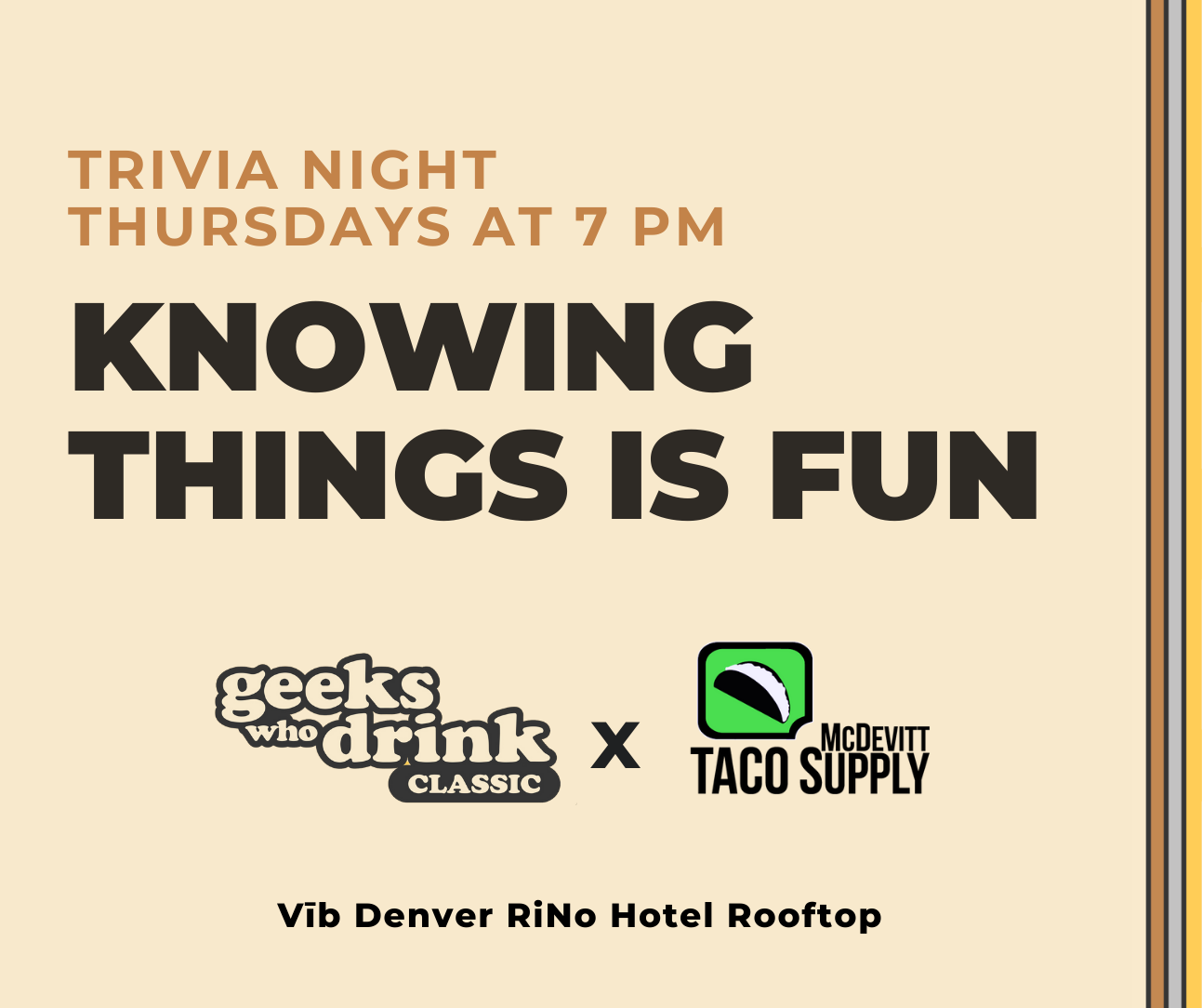 Geeks Who Drink brings the nation’s best live-hosted pub quiz to McDevitt Taco Supply located on our rooftop. Flex those brains with fun trivia, specials and prizes.
